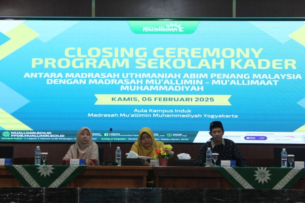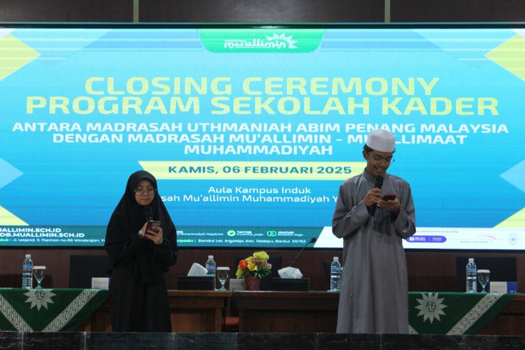 Acara ini bertajuk “Closing Ceremony Program Sekolah Kader“, dihadiri oleh pimpinan Madrasah Mu’allimin-Mu’allimaat Muhammadiyah, Ustazah Umi Unik Rasyidah, M.Pd. selaku Direktur Mu’allimaat dan Ustaz Zulkifli, S.Pd.I., M.Pd.I. selaku Wakil Direktur tiga Mu’allimin. Hadir pula Cikgu Besar Amal binti Ilyas selaku Kepala Sekolah—sekolah rendah Madrasah Uthmaniah (ABIM) Pulau Pinang, Malaysia. Tak lupa santriwan-santriwati Mu’allimin-Mu’allimaat serta peserta student exchange Alumni Madrasah Uthmaniah (ABIM) yang berjumlah 12 siswa-siswi.